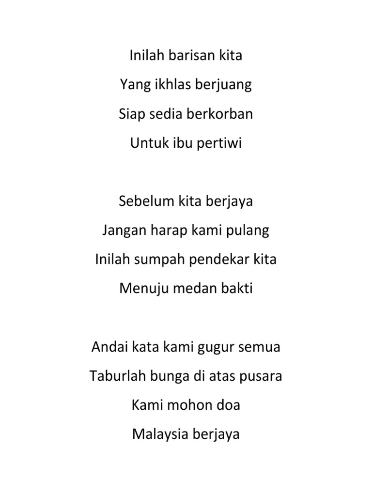 Lirik lagu ini Ia berbentuk perjuangan yang menceritakan pengorbanan para perajurit negara yang ikhlas berjuang di medan peperangan untuk mempertahankan negara. Lirik Lagu Keranamu Malaysia Lagu Patriotik. Lirik Lagu Tanah Pusaka Lagu Patriotik.
