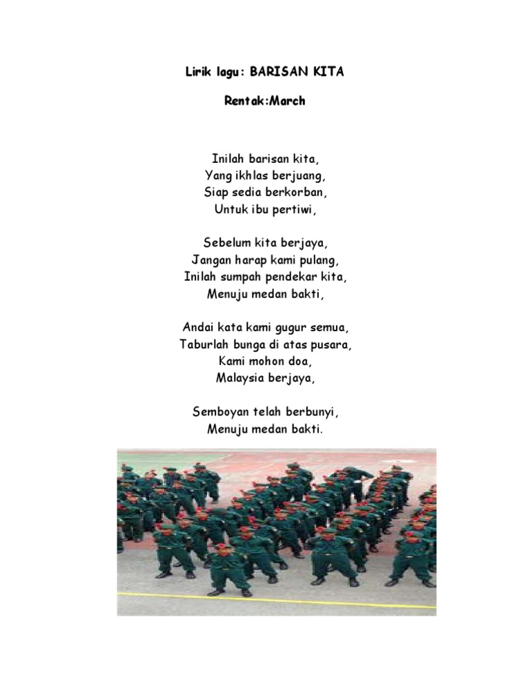 Muat turun halaman 1-48 di AnyFlip. PAUD SPS Catleya 62 merasa sangat terbantu akan adanya mahasiswa KKN Kolaboratif Kelompok 240 karena dapat mengatur barisan para siswa dan wali murid agar tetap rapi. Lirik Lagu Inilah Barisan Kita Lagu Patriotik.